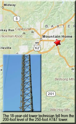 May 30, 2010 - The Baxter County Sheriff's office says an 18-year-old Missouri man has died after falling from a cell phone tower he was working on in Mountain Home, Ark.