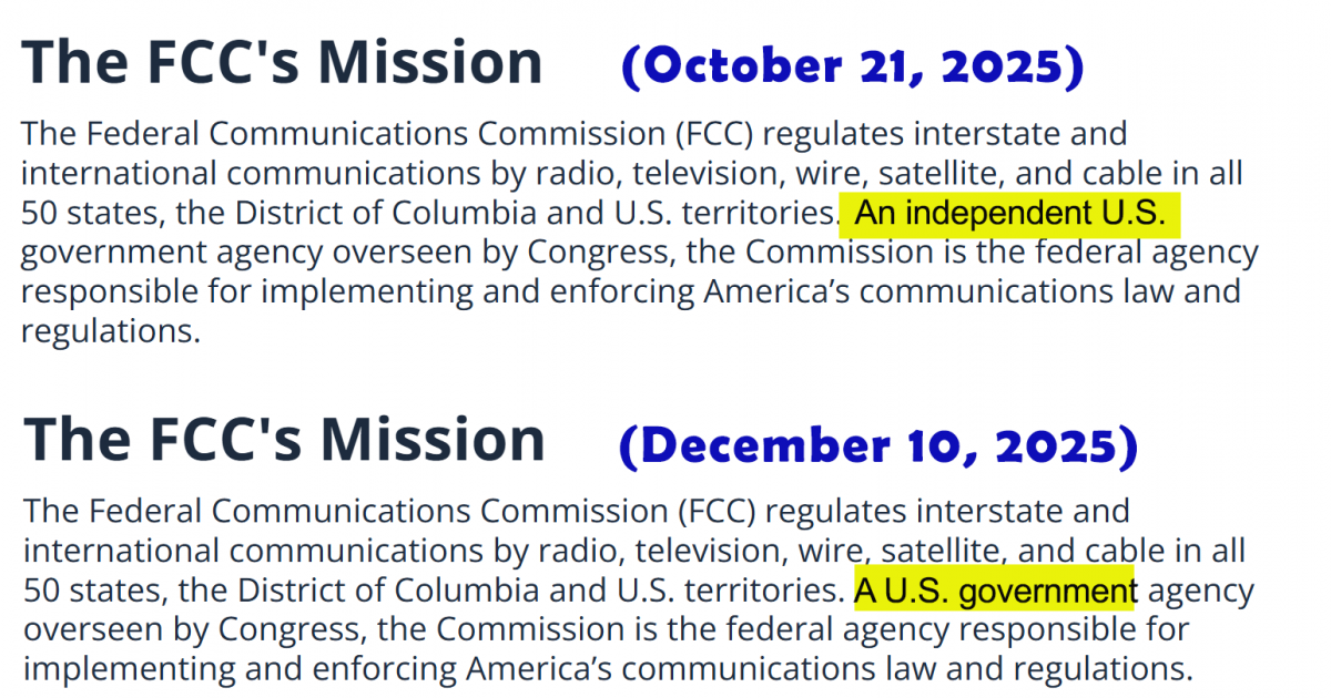 The most contentious moment in this week’s Senate oversight hearing of Federal Communications Commission leadership had nothing to do with spectrum auctions, broadband deployment, or media ownership. Instead, it revolved around a single word that has defined the agency for nearly a century: independent. By the end of the exchange, that word had disappeared from the FCC’s website (View Video Below).