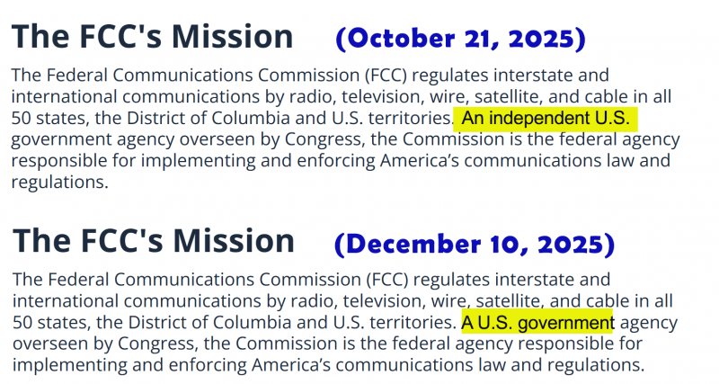 Historically, the FCC has consistently described itself as an independent regulatory agency. That description dates back to the Communications Act of 1934 and carried through decades of FCC annual reports, budget justifications, congressional testimony, and public statements. It remained intact when the FCC launched its website in 1995 and survived Republican and Democratic administrations alike. Until now, it had never been publicly repudiated by sitting FCC leadership.