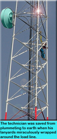 The tower erector’s buddy, seeing the whole thing happen, raced down the tower to help him. Was he ever glad to see him! His assistant got him around into the tower and used his positioning belt to secure him. About that time, his safety lanyards started sliding on down the load rope! Feeling temporarily secure, he began checking himself for missing body parts.